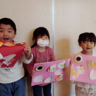 スタンプしたウロコや目玉をのりで貼付けました。たくさん貼る作業がありましたが「疲れたー」と言いながらも頑張ってのり付けしていましたよ👍