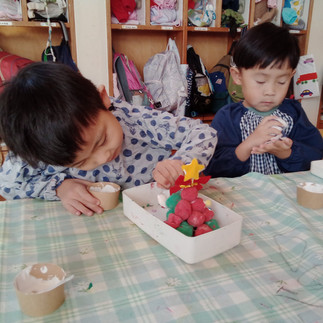 先日作った粘土ツリーにみんな楽しみにしていたキラキラスパンコールやポンポンをボンドで貼付けましたよ。