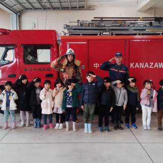 お礼拝のあとはひかりぐみさんが幼稚園を代表していつもみんなの安全を守ってくださっている小立野消防所にありがとうの気持ちを込めて讃美歌と果物を届けに行きました。