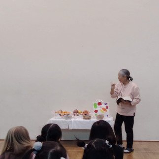 お昼ご飯はみんなでホールに集まり持ち寄った果物をいただきました。